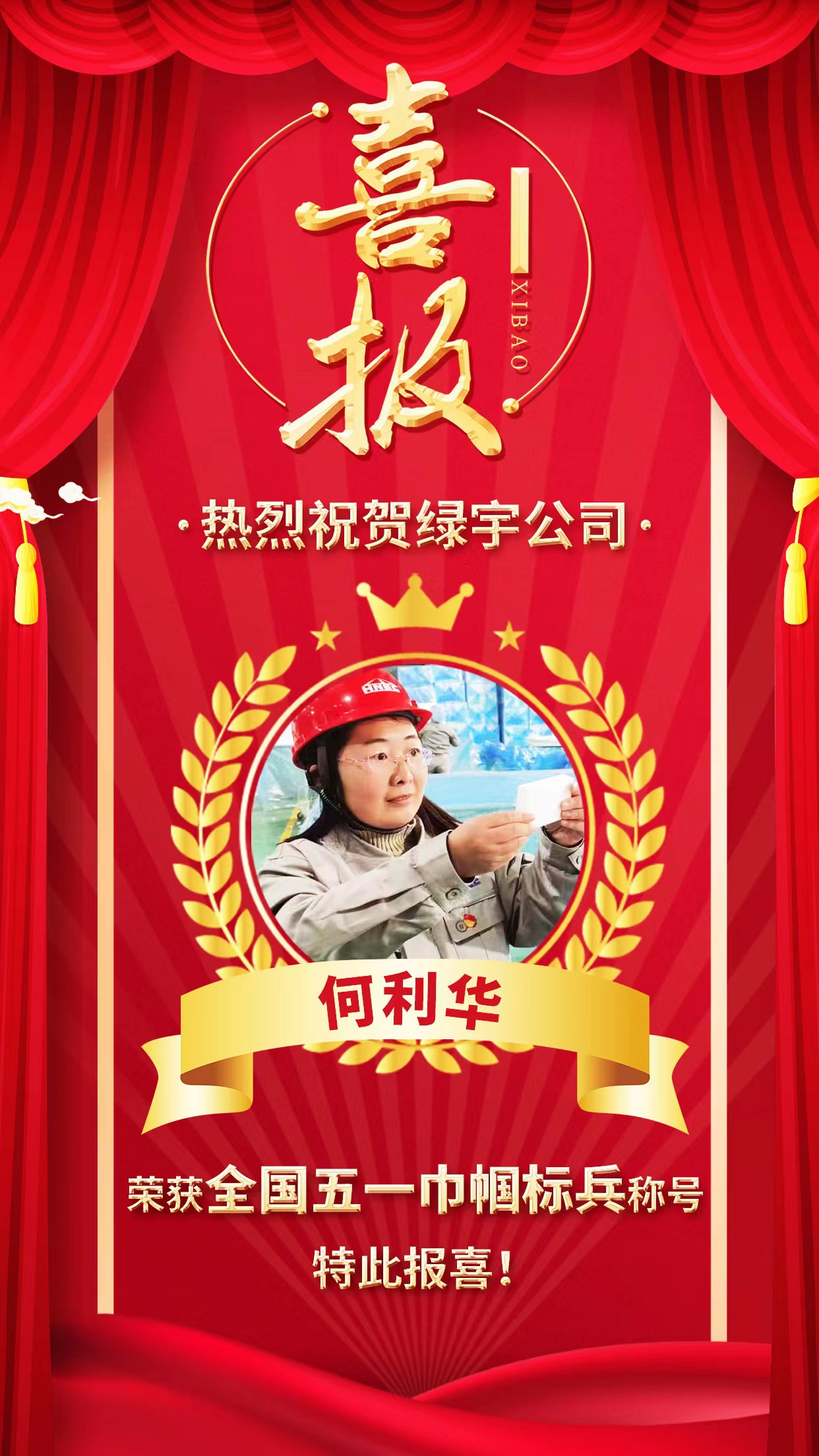 喜報(bào)!熱烈祝賀綠宇公司何利華榮獲“全國五一巾幗標(biāo)兵”稱號